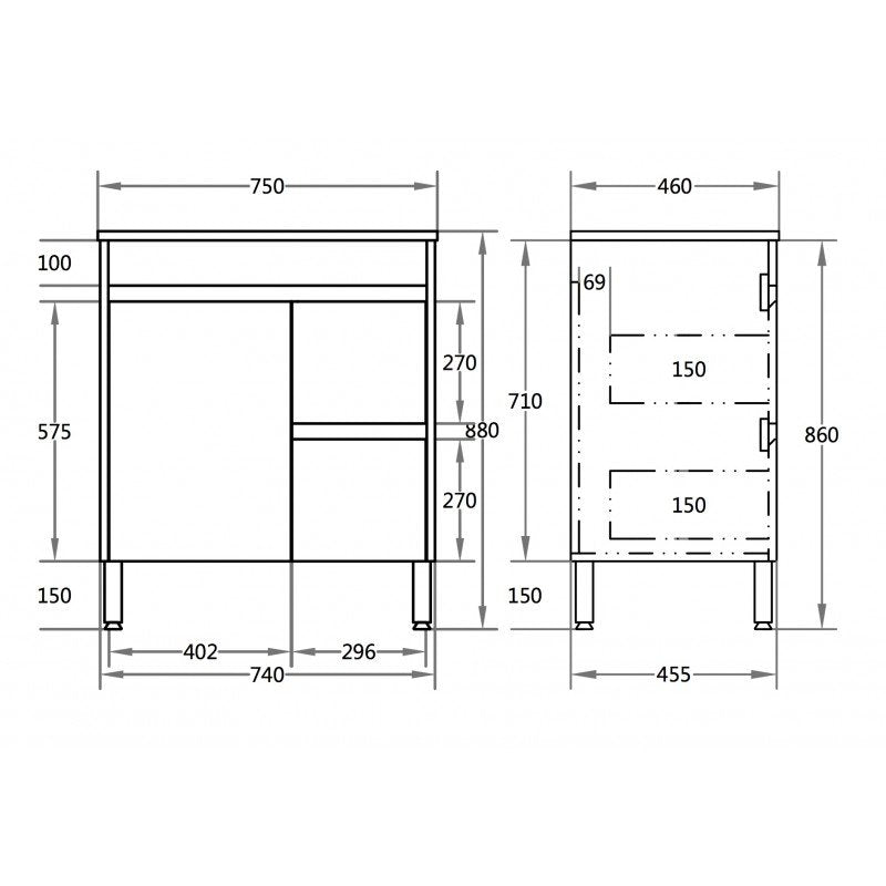 750x460x880mm Bathroom Vanity Thin Ceramic Top/Poly Top White Polyurethane PVC Freestanding Right Side Drawers