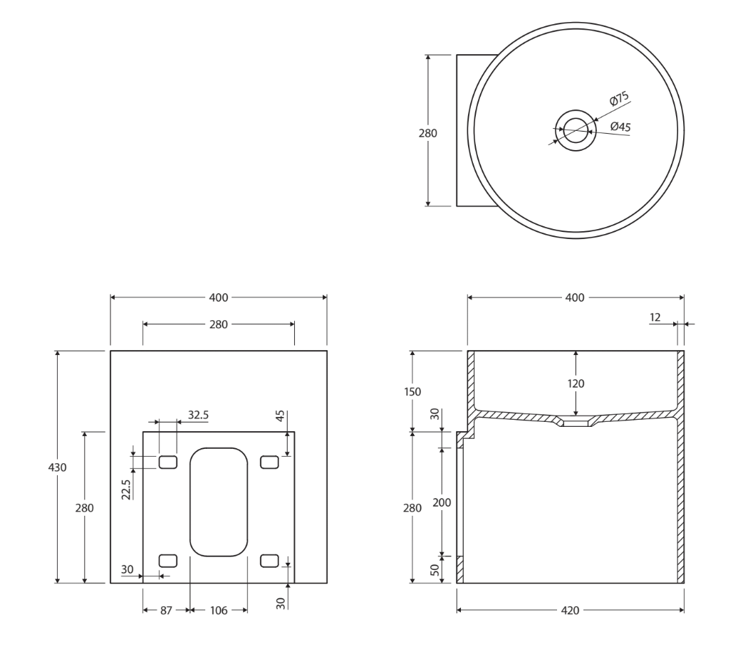 Outer Dimensions: 430 x 400 x 400 mm