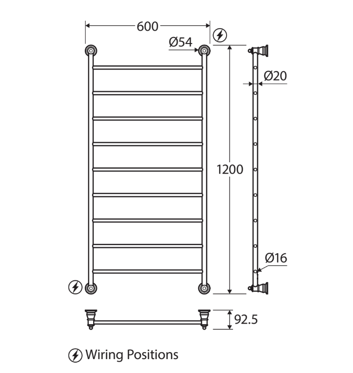 Lillian Heated Towel Rail, 600 x 1208mm, Brushed Nickel