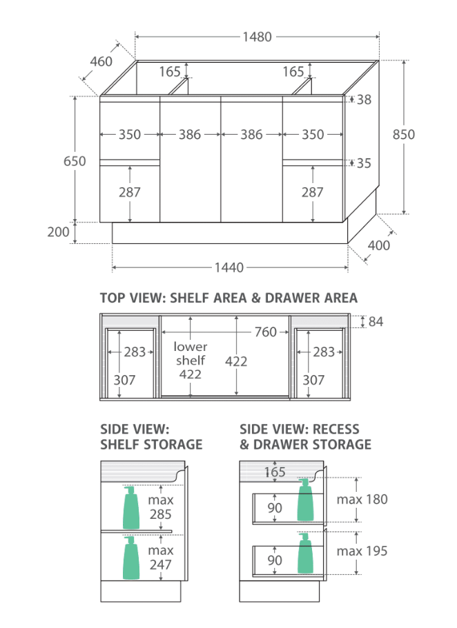 Width: 1500mm x Depth: 460mm x Total Height: 870mm